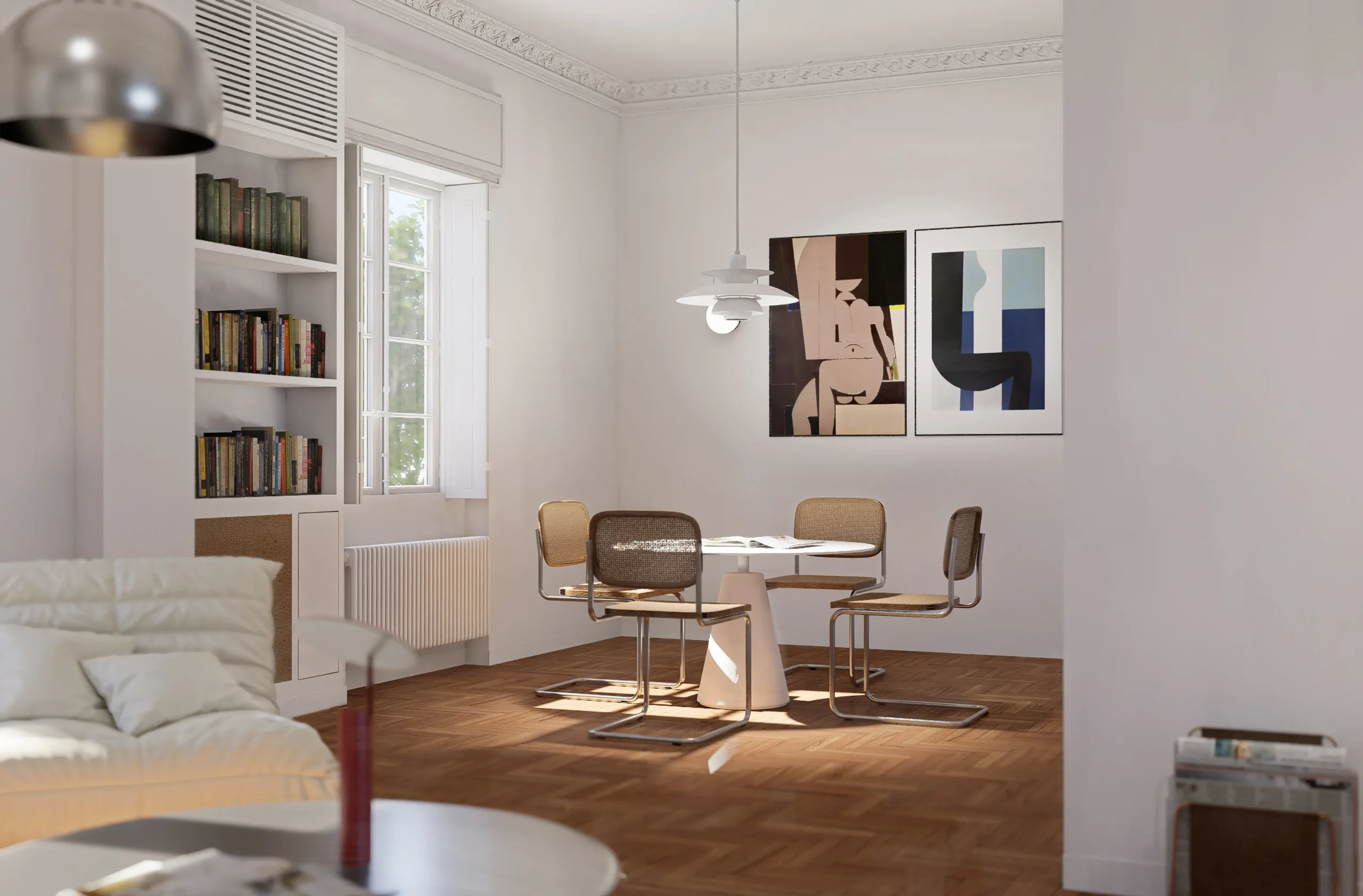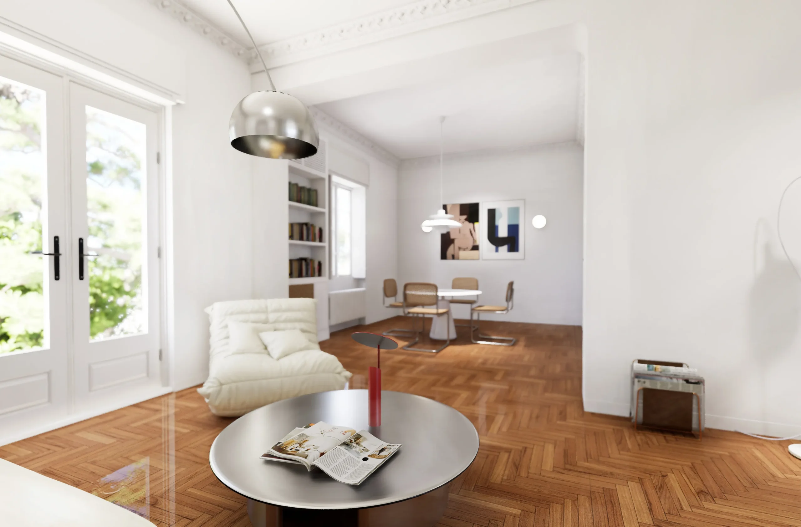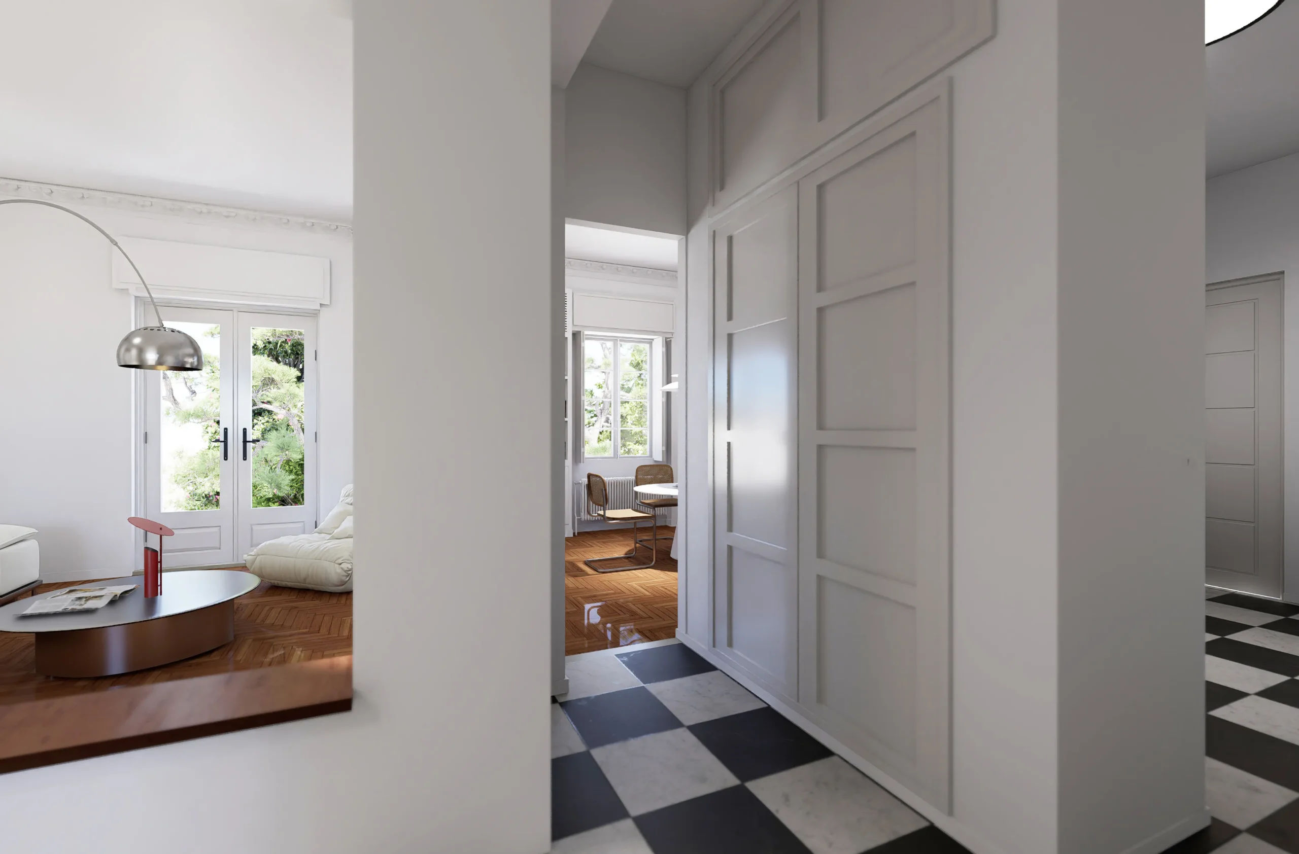 The renovation is structured through a clear spatial hierarchy, a redefinition of circulation patterns and a reconfiguration of uses, while preserving the character of the apartment and reinforcing the relationship between private areas and shared living spaces.