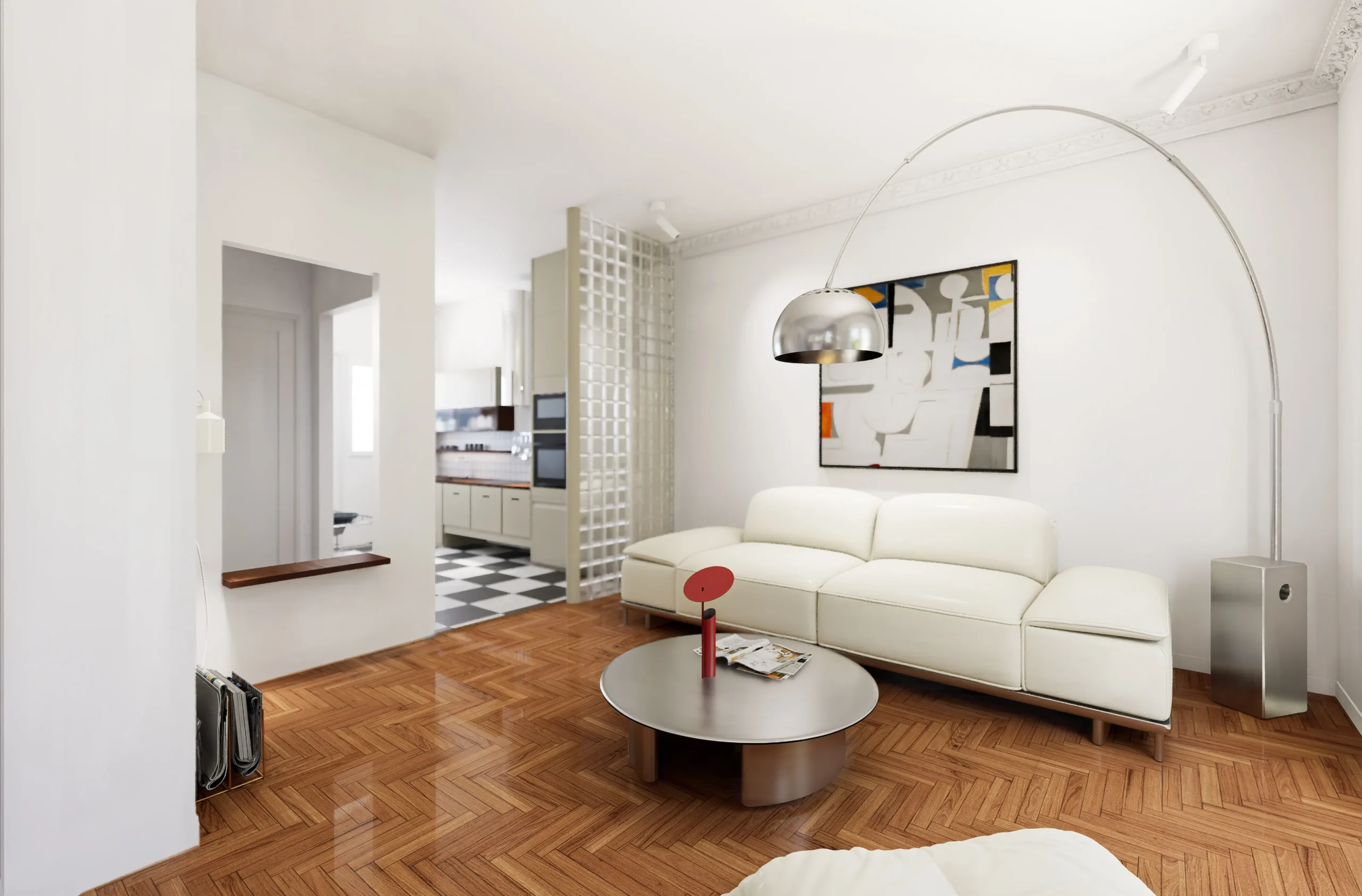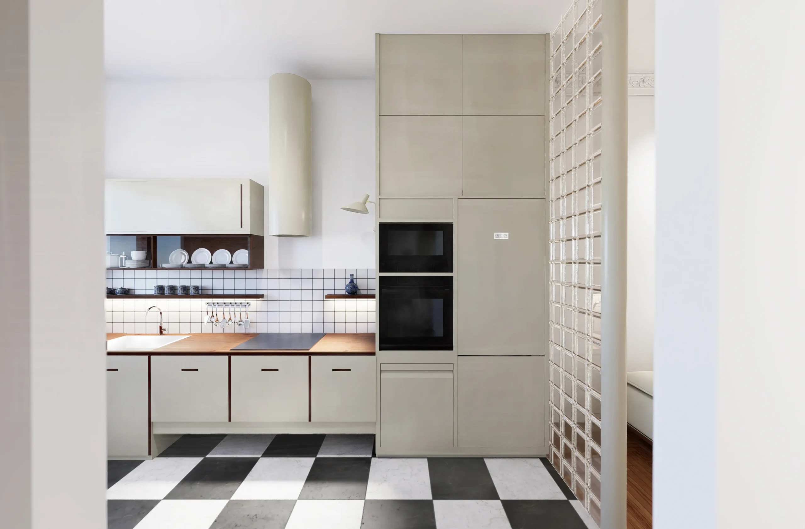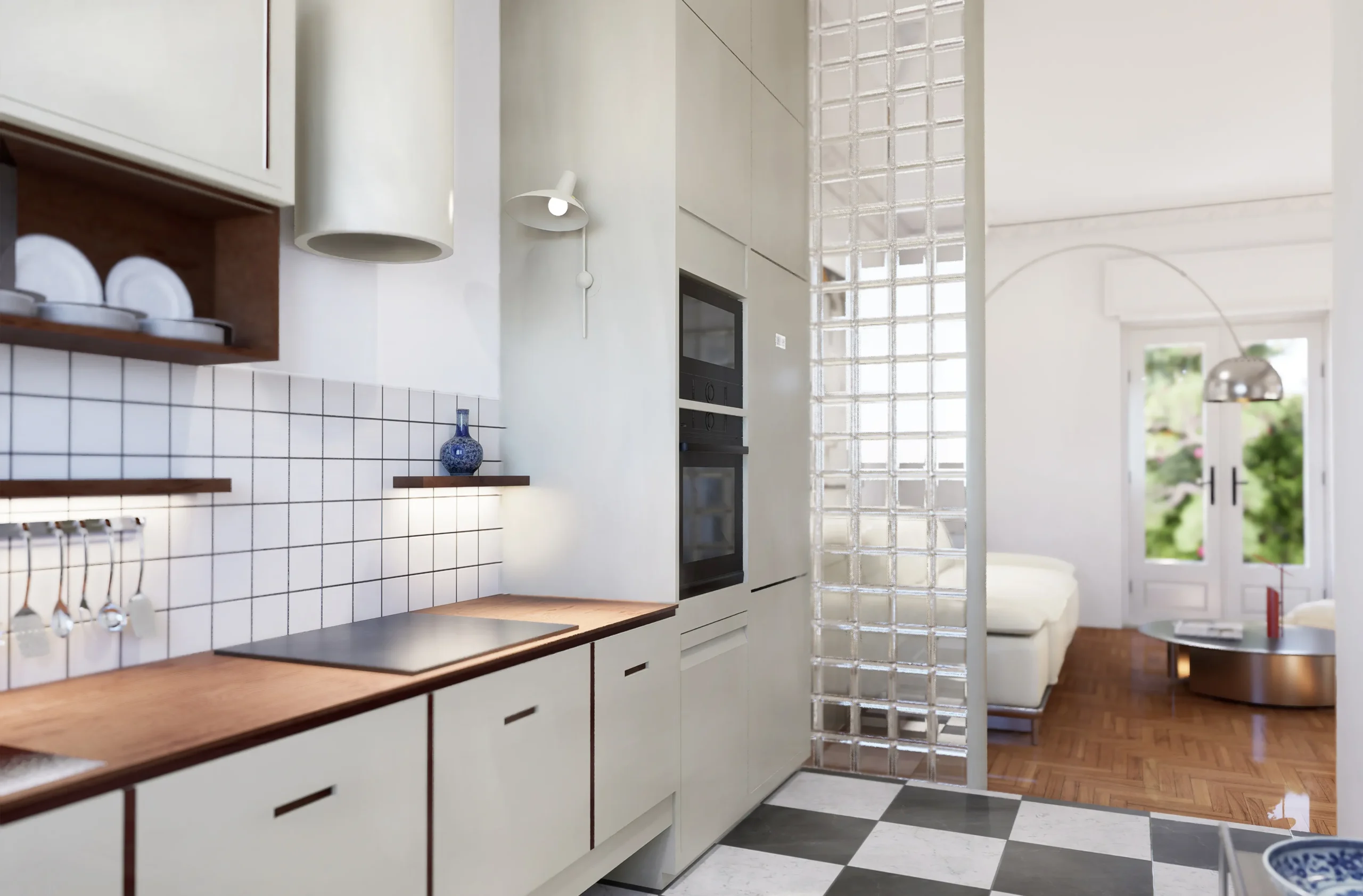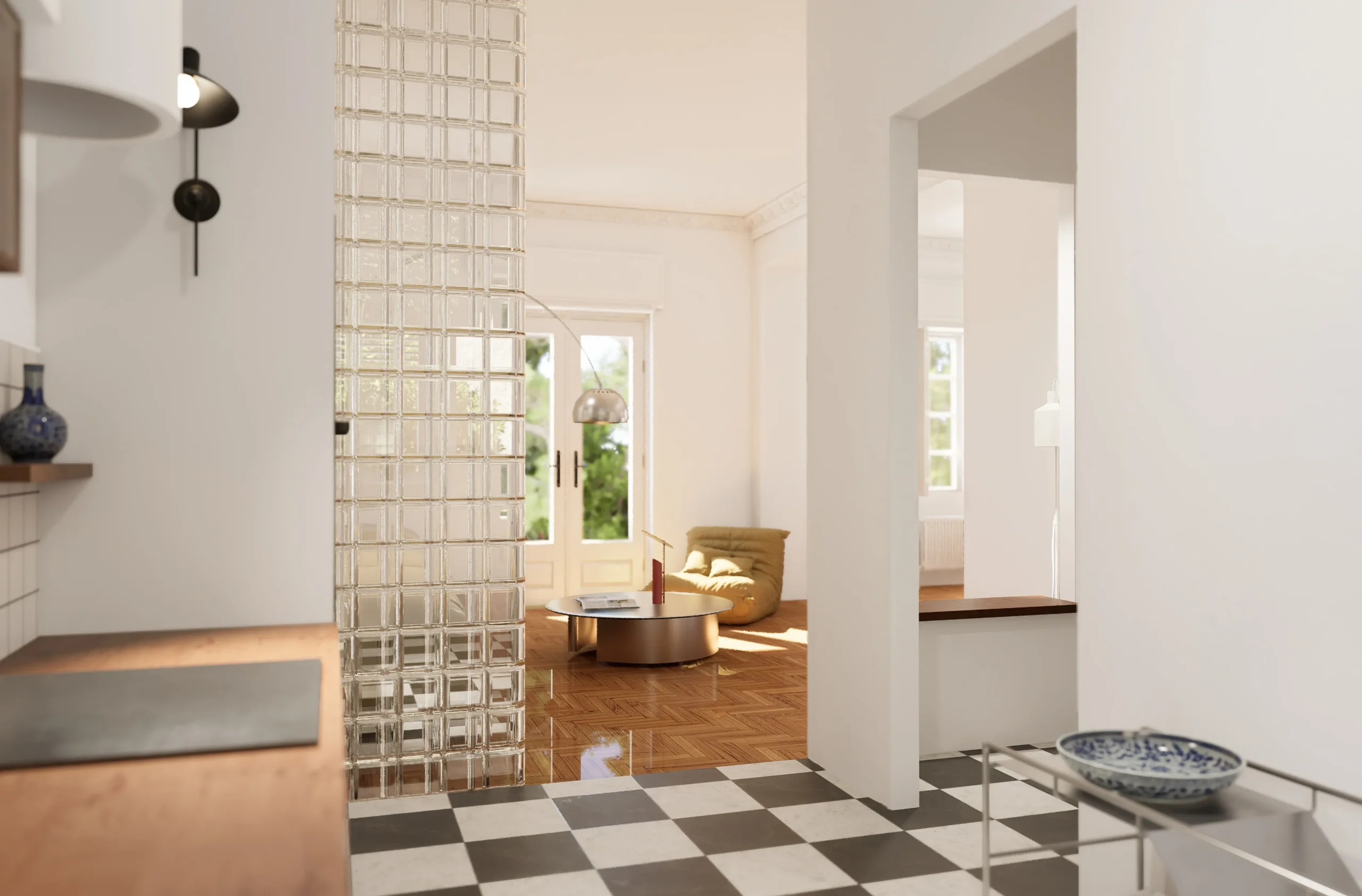 The main entrance hall functions as a central node, connecting the private areas with the living room and the kitchen. Within the living space, the kitchen is integrated through the use of a perforated glass-block partition, allowing visual continuity, increased natural light, and improved everyday circulation. At the same time, alternative access routes to the kitchen are created without disrupting the primary spatial organization.